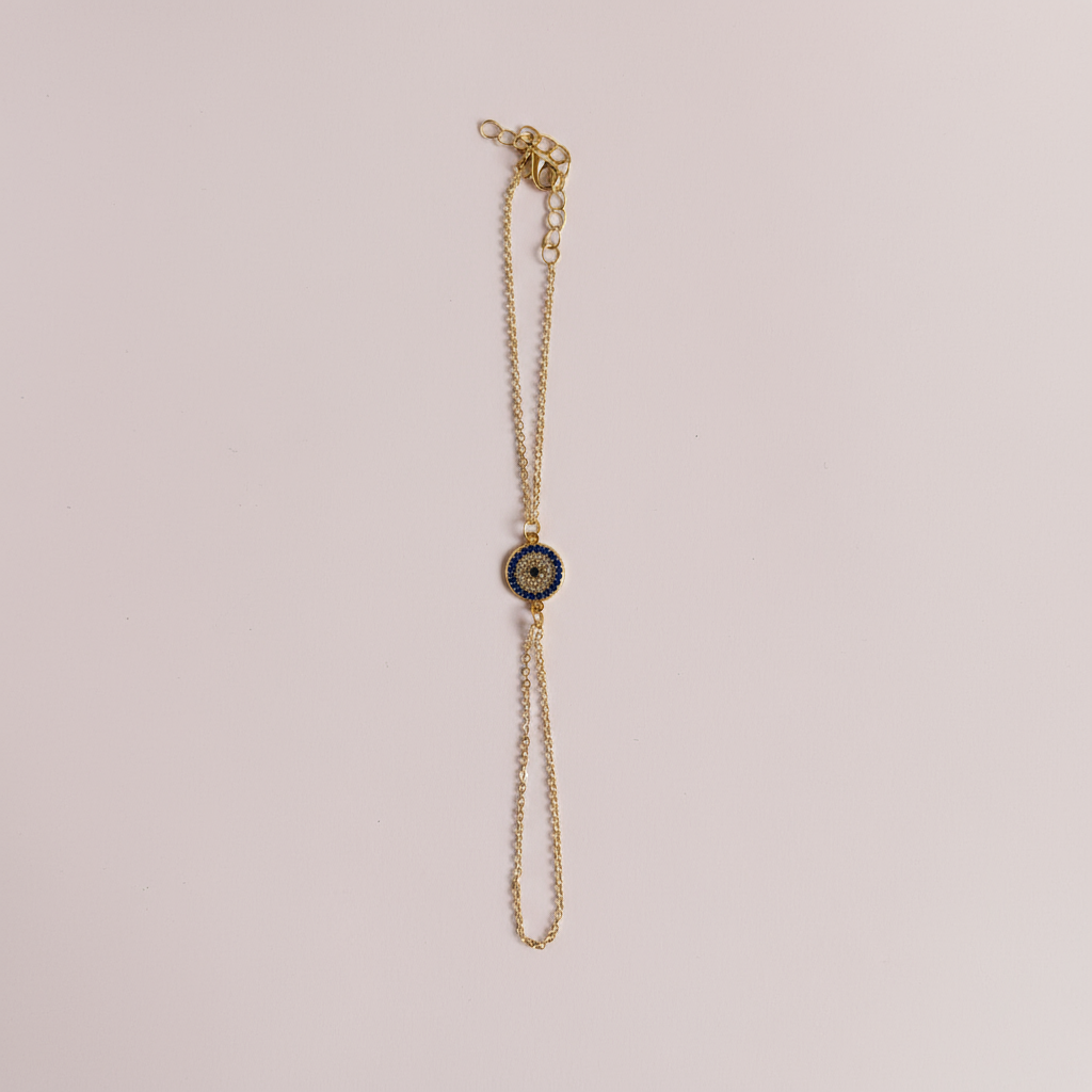 Minimal ve modern tasarımıyla öne çıkan İrva Collection Gold Eye Chain, bilek ve parmak arasında zarif bir zincirle birleşen nazar boncuğu detayıyla şıklığınıza fark katıyor. Günlük kombinlerde veya özel davetlerde hem stilinizi tamamlayan hem de koruma sembolü taşıyan anlamlı bir aksesuar.