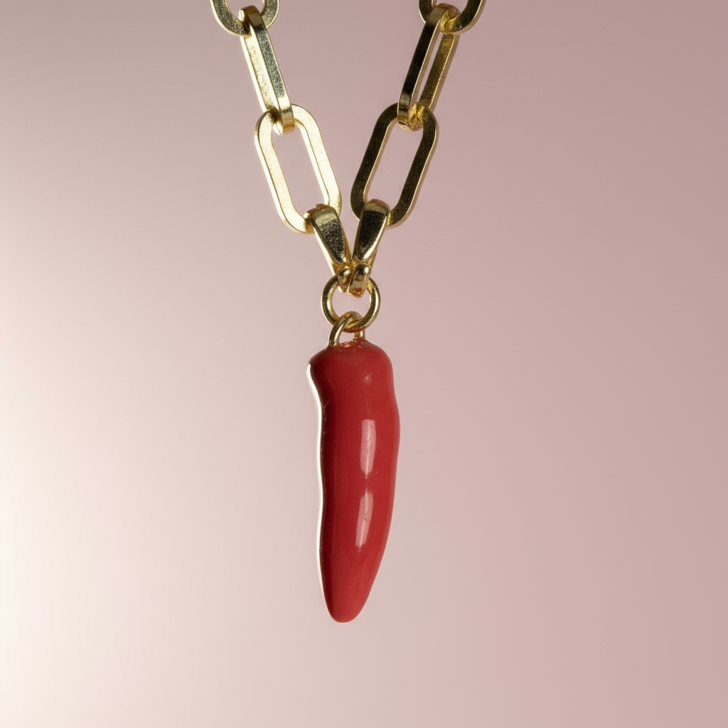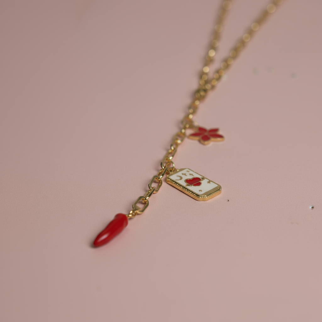 • Kolye kaliteli bijüteri malzemeden üretilmiştir. Cilt pH değeri, ter veya tuz seviyesine bağlı olarak zamanla renk değişimi gösterebilir. Uzun süre parlak kalabilmesi için yüzeyine özel bir koruma kaplaması uygulanmıştır; bu sayede kolye dış etkenlere karşı daha dayanıklı hâle gelir.