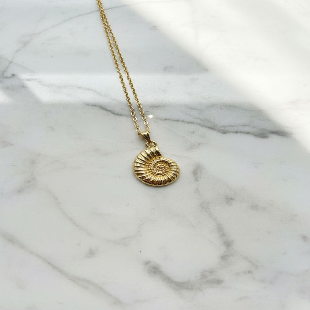 Altın kaplama zinciri ve salyangoz formundaki deniz kabuğu ucu ile tasarlanan bu kolye, doğanın zarafetini modern bir tarzla buluşturur. Yazın enerjisini ve denizin huzurunu yansıtan tasarımıyla her kombine zarif bir dokunuş katar.