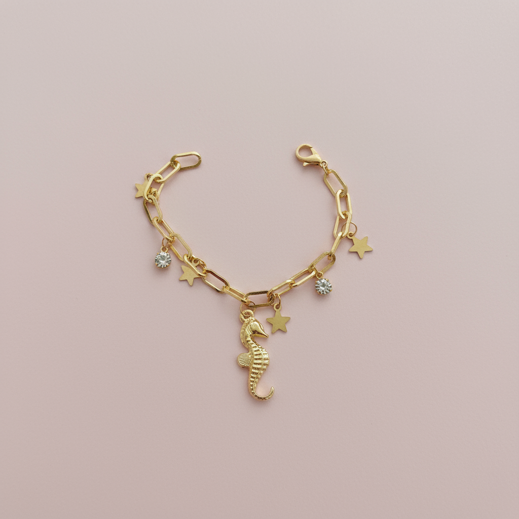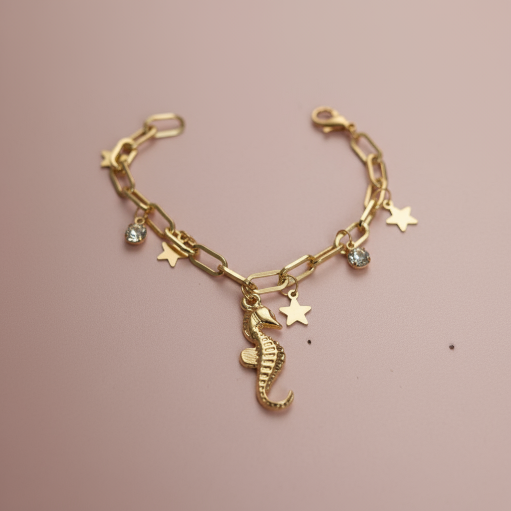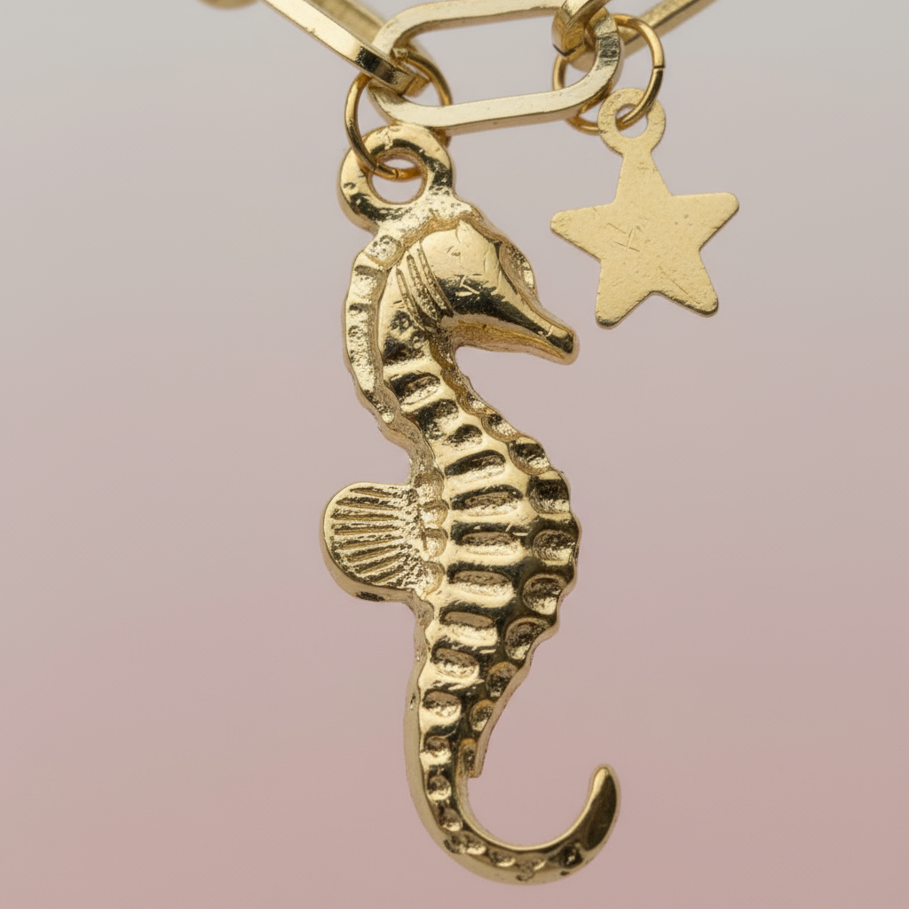 Deniz esintisini stilinize taşımak isteyenler için tasarlanan Deniz Atı Bileklik, altın kaplama yüzeyi ve özenle işlenmiş deniz atı figürüyle hem günlük kullanımda hem de özel anlarda bilekte şık bir duruş sağlar. Minimalist ve zarif tasarımı sayesinde her kombine uyum sağlar ve stilinize sofistike bir dokunuş ekler.