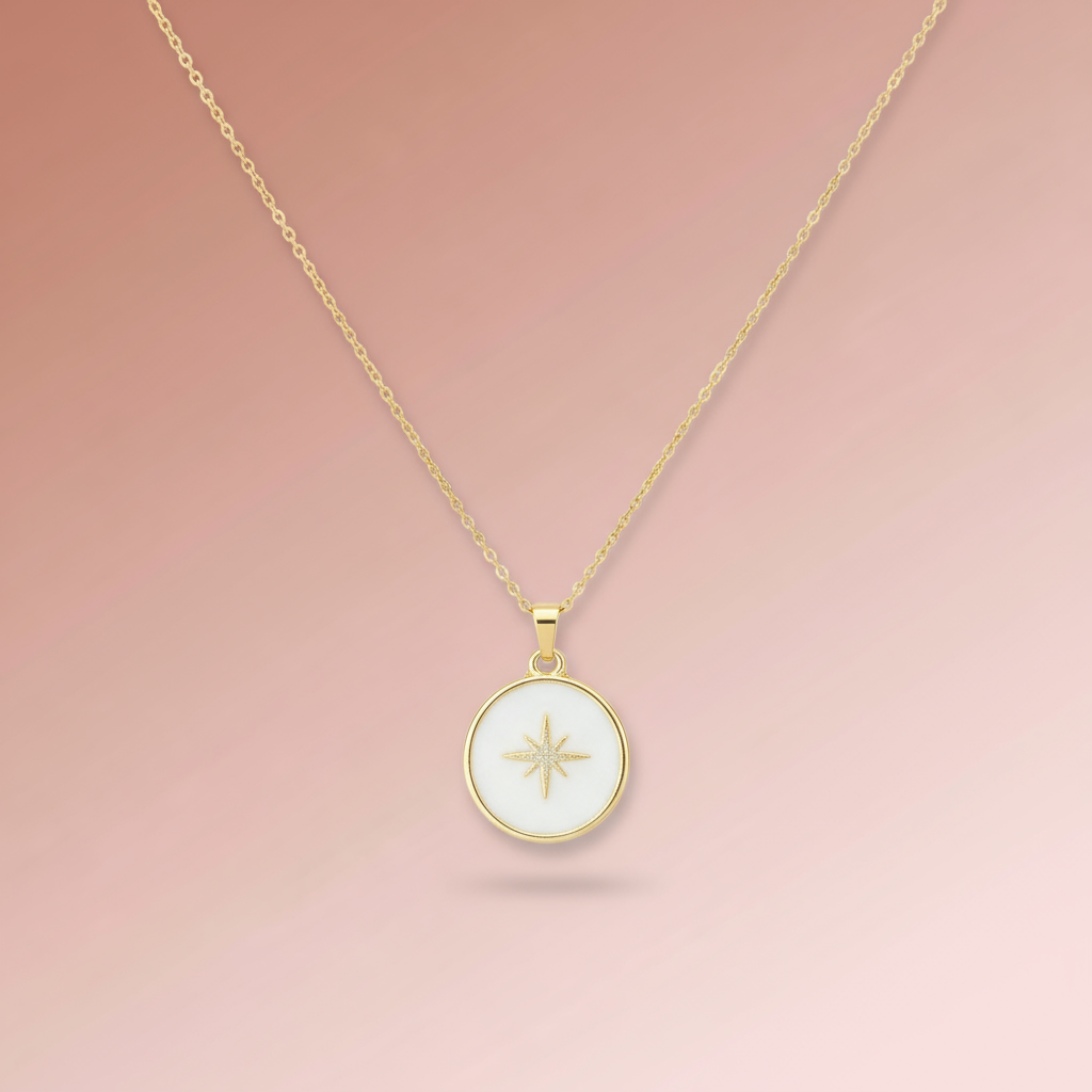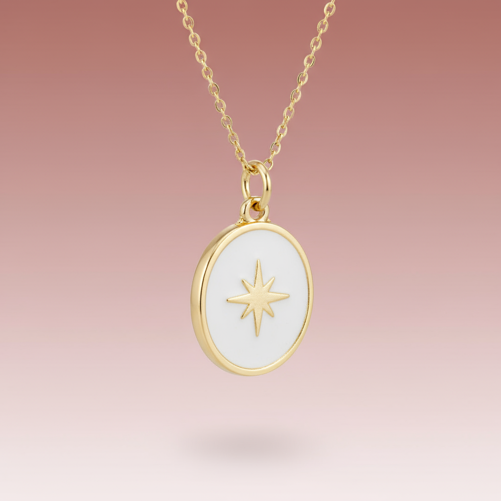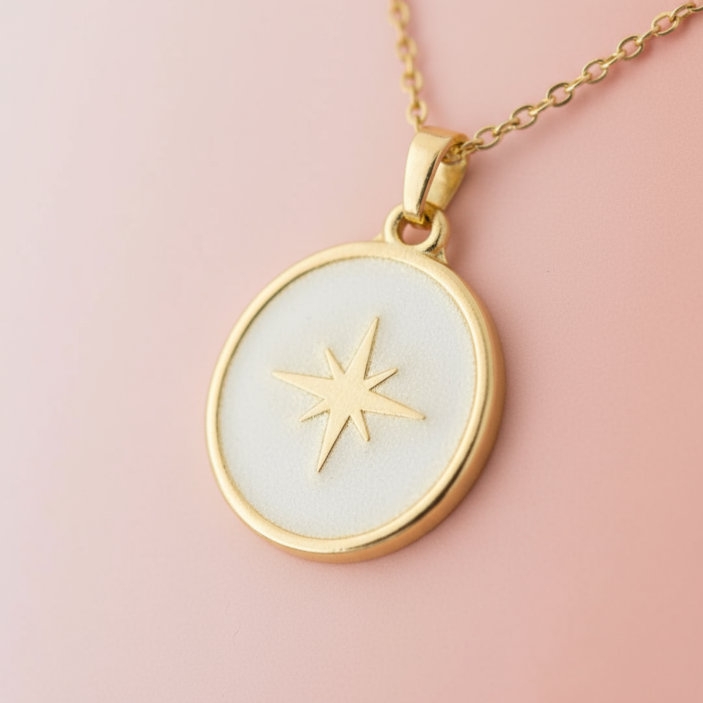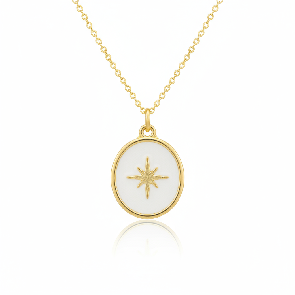 Zarafeti ve modern ışıltıyı bir araya getiren Beyaz Mineli Kutup Yıldızı Kolye, minimal tasarımı ve parlak yüzeyiyle her stile uyum sağlayan özel bir aksesuardır. Beyaz mine kaplama, kolyeye hem temiz hem de sofistike bir görünüm kazandırırken; kutup yıldızı figürü yol gösterici ışığı, şansı ve pozitif enerjiyi temsil eder. Günlük kombinlerden özel gün şıklığına kadar her ortamda ideal bir tamamlayıcıdır.