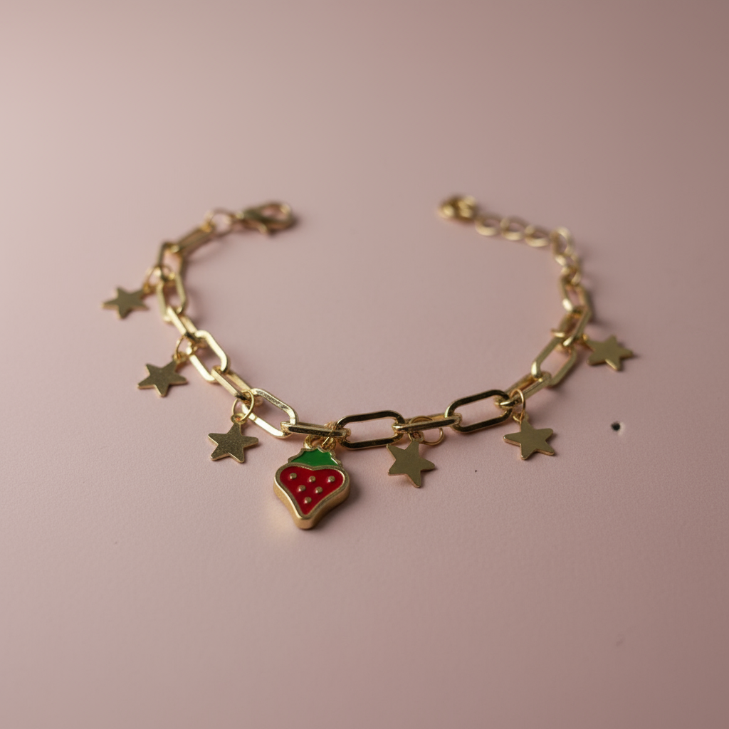 Neşeli ve şık bir aksesuar arayanlar için tasarlanan Çilek Charm Bileklik, altın kaplama yüzeyi ve detaylı çilek charm tasarımıyla hem günlük kullanımda hem de özel anlarda bilekte göz alıcı bir duruş sağlar. Charm tasarımı bileğe hareket ve sevimli bir dokunuş katarak her bakışta dikkat çeker.