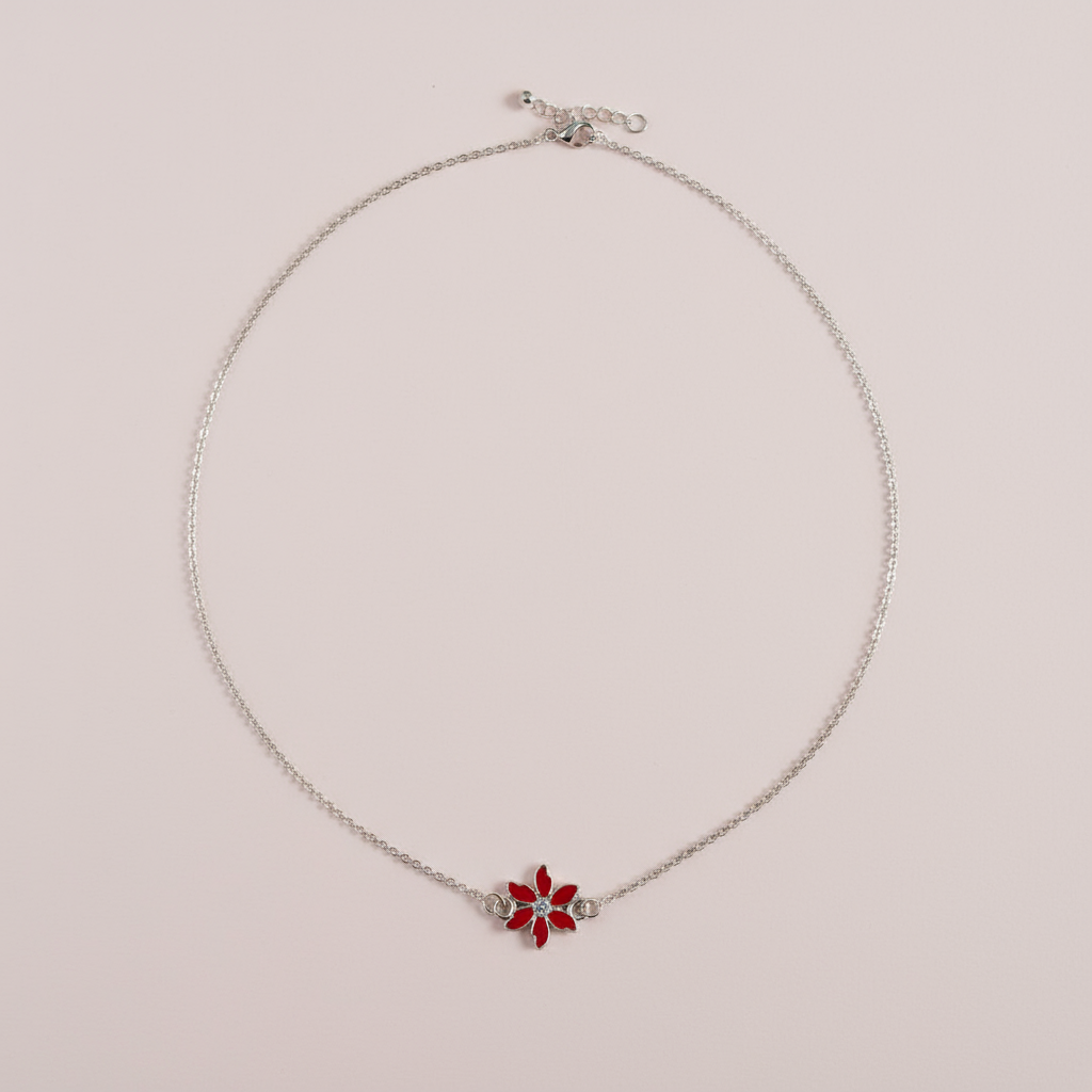 Çelik Gümüş Kırmızı Çiçek Kolye
